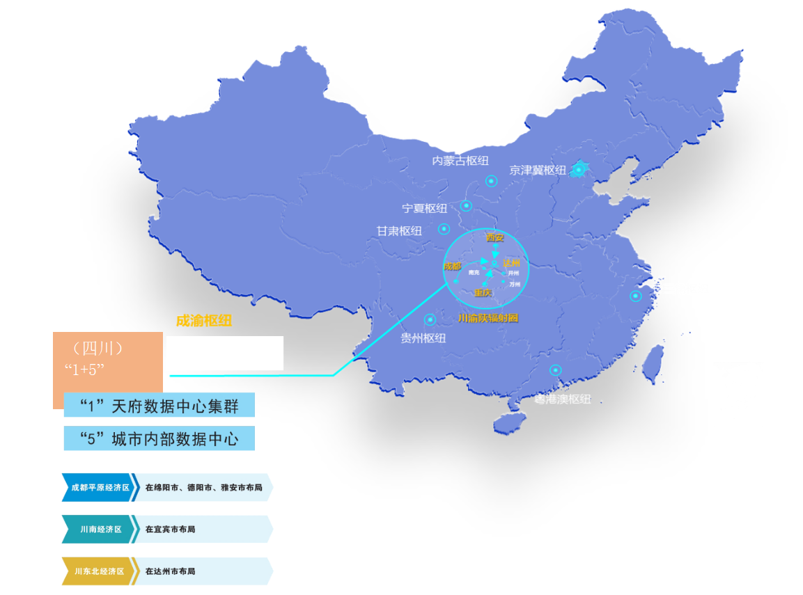 2022年2月,国家发展改革委批复同意在成渝地区启动建设全国一体化算力国家枢纽节点。按照四川省委、省政府工作部署和批复要求,2022年7月20日,四川省发展改革委等6部门联合印发《全国一体化算力网络成渝国家枢纽节点(四川)实施方案》(川发改数字〔2022〕380号),综合考虑四川产业布局、能源结构和气候、地质等条件,重点建设天府国家数据中心集群起步区(双流、郫都、简阳)和在成都平原经济区(绵阳市、德阳市、雅安市)、川南经济区(宜宾市)、川东北经济区(达州市)适度建设若干3000标准机架以下城市内部数据中心(即四川“1+5”布局)。其中明确达州市依托达州高新区,打造大数据区域协同创新基地,服务川东北经济振兴发展。