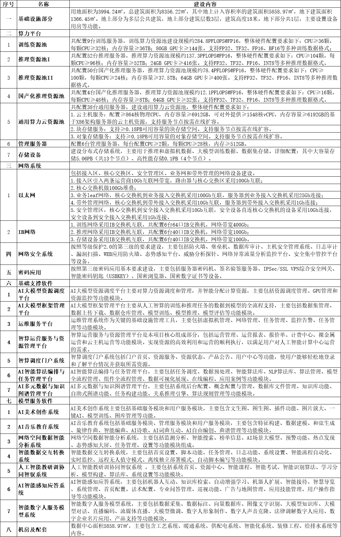 数据中1栋(规划总建筑面积8356.22㎡,地上计容建筑面积5858.97㎡,地下建筑面积1366.45㎡,地上三层,地下一层,建筑高度18米,含电气、暖通、消防、给排水等配套工程),以及购置服务器81台(折合标准机架445个、上架率95.32%)、英伟达H100 144张、4090 72张、昇腾910B 32张、海光K100_AI 400张等先进算力芯片(国产化率66.67%),建成智算399.02P、可存储容量5PB,运行PUE值1.247。