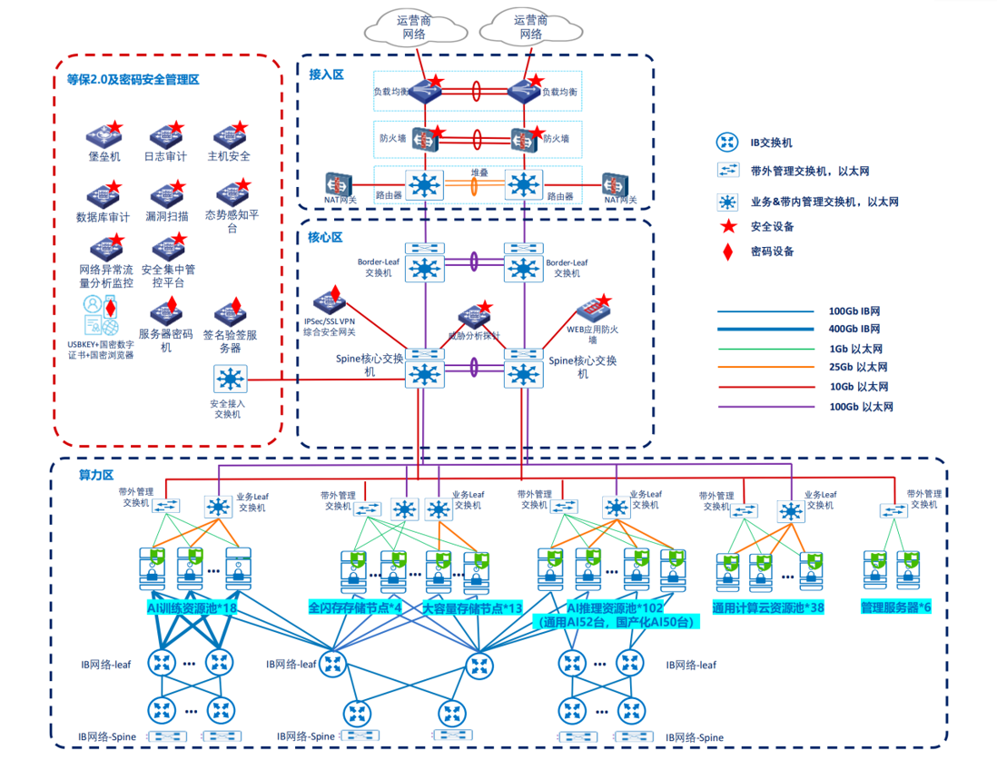 接入层通过接入交换机将系统所有硬件设备,包括:AI训练资源池、AI推理资源池、管理服务器、应用服务器存储设备、安全设备统一接入进行组网。