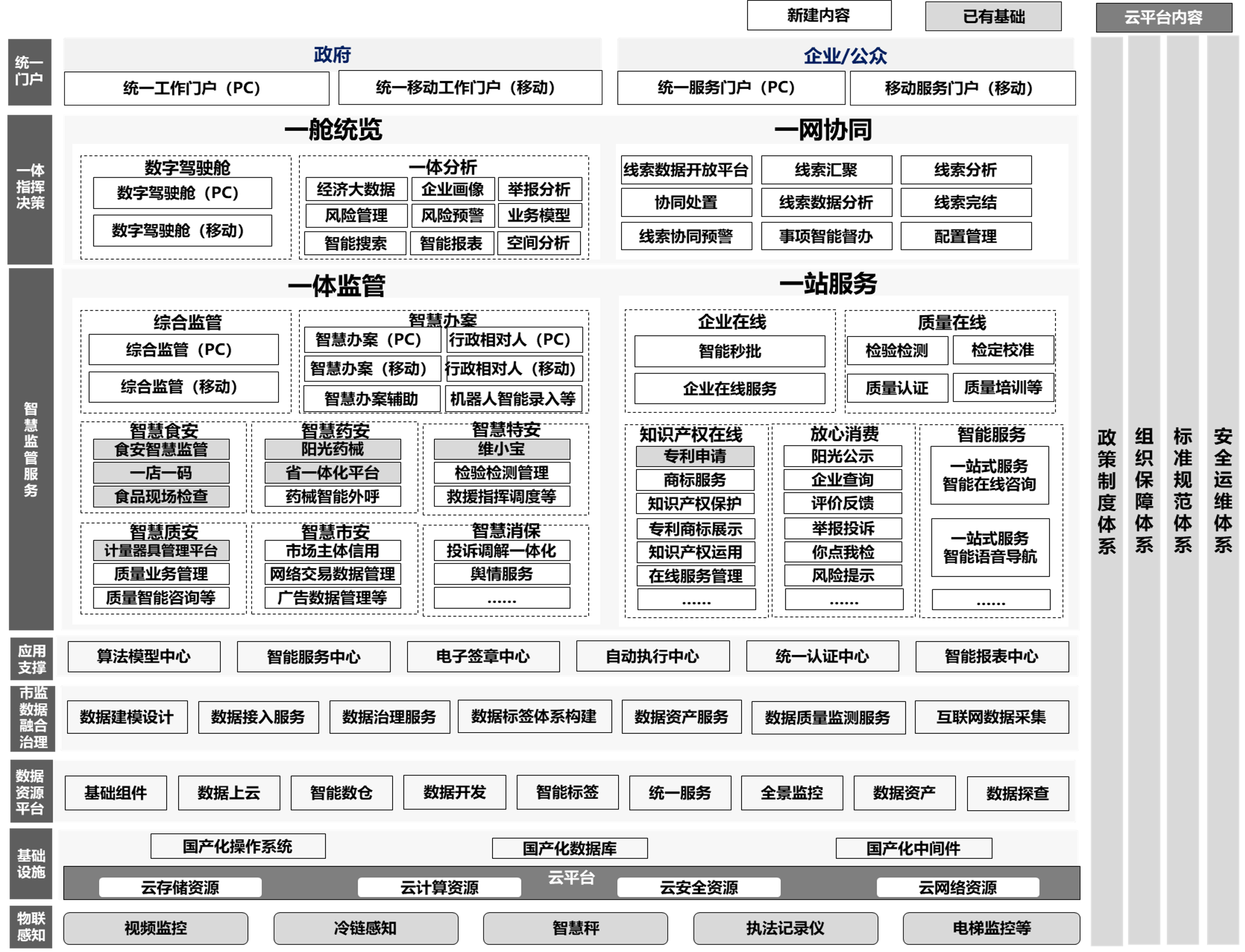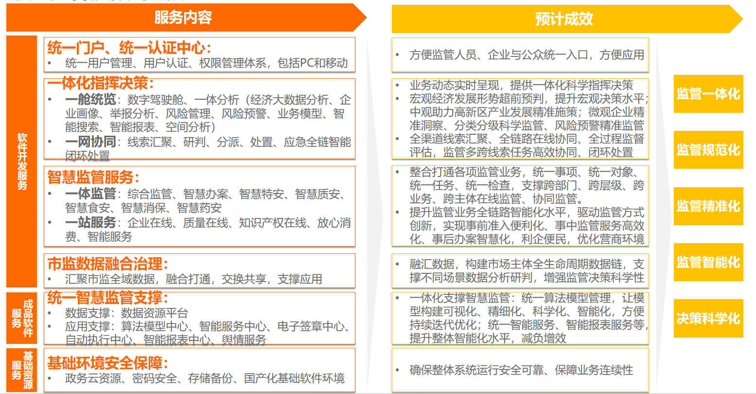 包括统一门户、一体化指挥决策、智慧监管服务、应用支撑、市监数据融合治理、数据资源平台等版块,由数据资源平台提供数据资产定义、加工、管理、服务的全流程保障能力;市监数据融合治理汇聚各业务系统数据,并提供数据支撑;应用支撑为各业务应用提供智能工具,提高业务智慧化水平;智慧监管服务为全区市场主体、消费者、各部门、街道。提供监管服务;一体化指挥决策打通监管服务流转流程,构建数据智能辅助决策能力;统一门户提供业务系统统一入口,实现全局一体监管服务统一接入。