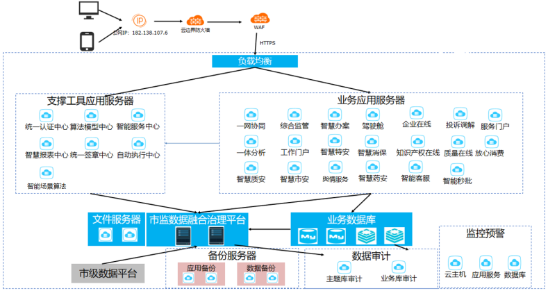 网络拓扑主要由市级数据平台、市监数据融合治理平台、业务数据库、文件服务器、备份服务器、数据审计、监控预警、支撑工具应用服务器、业务应用服务器组成,上述业务部署在云上。互联网桌面和移动端用户使用公网IP通过云边界防火墙、WAF访问云内系统。