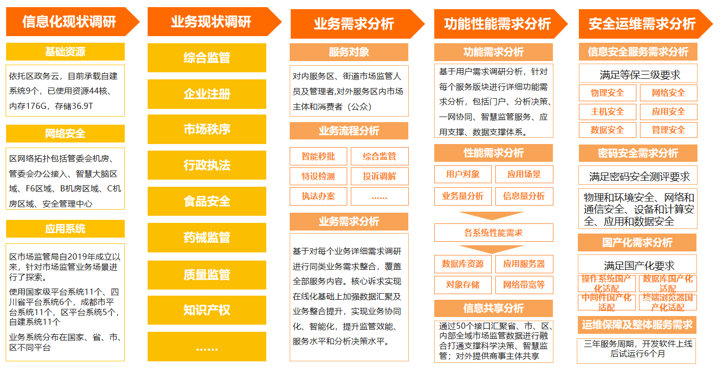区级智慧市监项目将对外服务区内市场主体、消费者,对内服务区各部门、街道。基于区市场监管局业务协同低效、自由裁量空间大、数据决策困难、监管力量不足的问题,本次项目将加强全局监管一体化应用能力,通过构建统一门户、一体化指挥决策、智慧监管服务、应用支撑、市监数据融合治理、数据资源平台等版块,打造统一监管线索、统一监管主体、统一监管事项,构建集全流程协同处置、监管标准规范、数据归集共享、业务智能辅助于一体的智慧市场监管体系,实现一舱统览、一网协同、一体监管、一站服务,最终形成“一体化、规范化、精准化、智能化”的一体化智慧市场监管创新发展新格局,助力全国建设统一大市场。