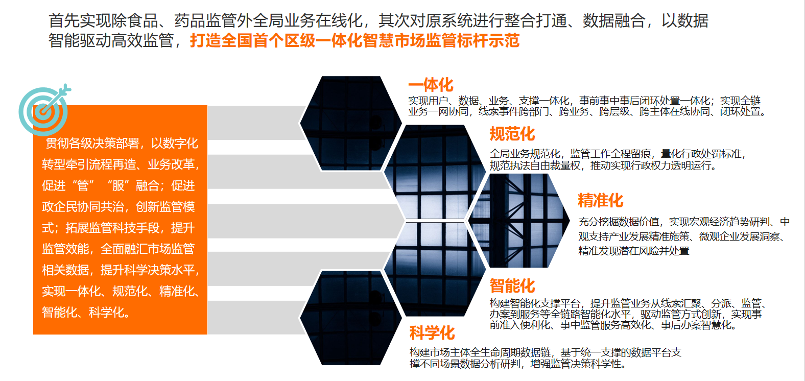 包括统一门户、一体化指挥决策、智慧监管服务、应用支撑、市监数据融合治理、数据资源平台等版块,由数据资源平台提供数据资产定义、加工、管理、服务的全流程保障能力;市监数据融合治理汇聚各业务系统数据,并提供数据支撑;应用支撑为各业务应用提供智能工具,提高业务智慧化水平;智慧监管服务为全区市场主体、消费者、各部门、街道。提供监管服务;一体化指挥决策打通监管服务流转流程,构建数据智能辅助决策能力;统一门户提供业务系统统一入口,实现全局一体监管服务统一接入。